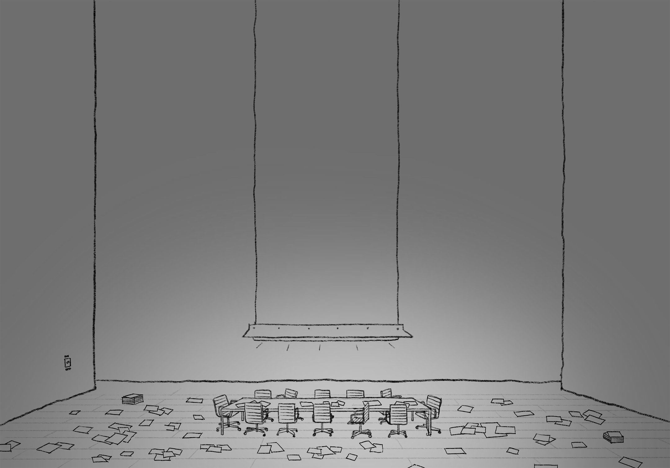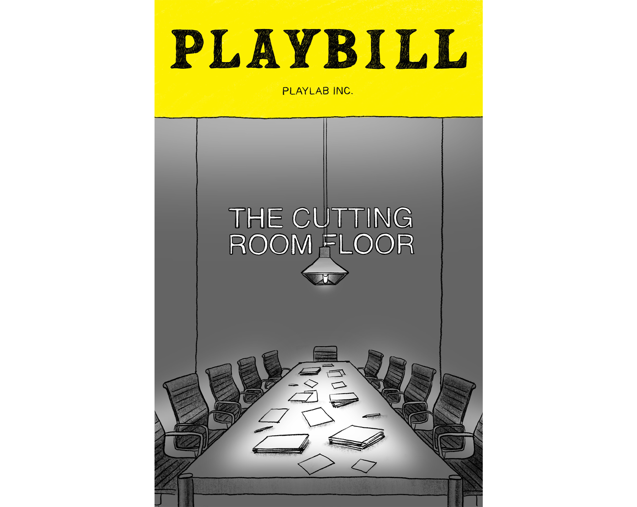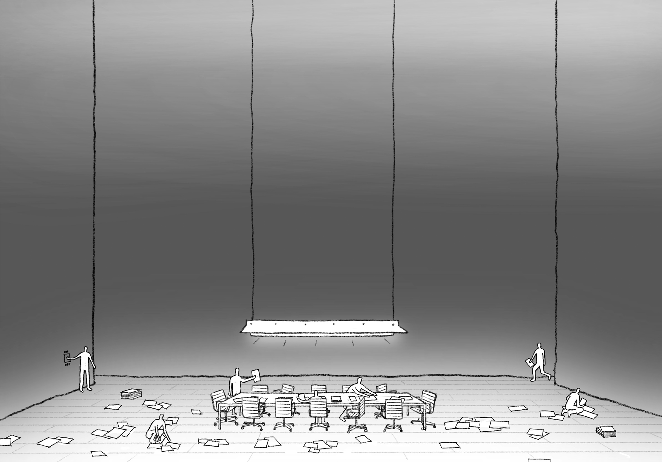 PL-Cutting-Room-Floor-3.pngThe play opens on a single meeting room. The audience can barely see anything, as the lights are dimmed to a minimum. Squinting, they can barely make out a long table in the middle of the room, with office chairs around it. Papers are scattered on the floor.