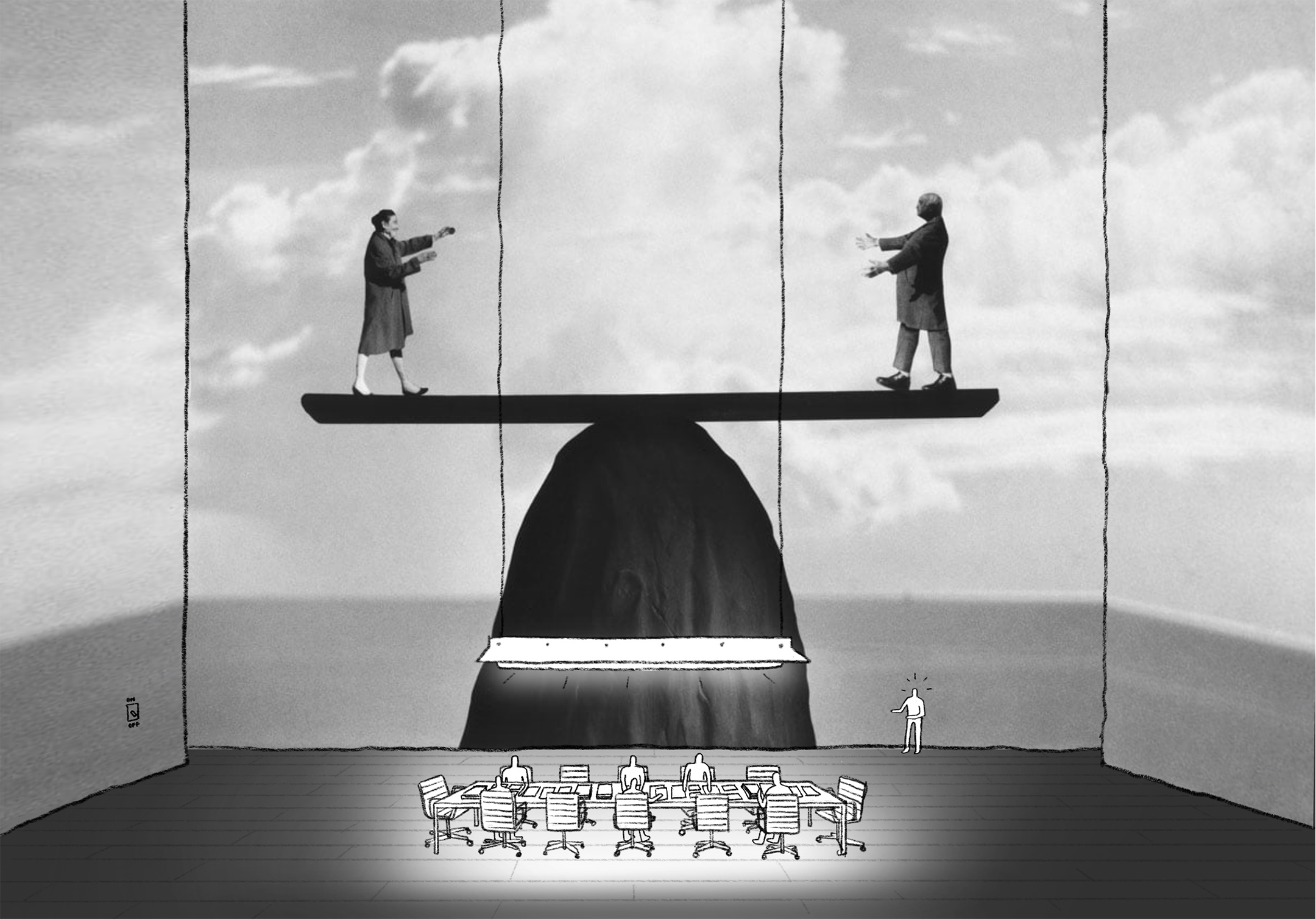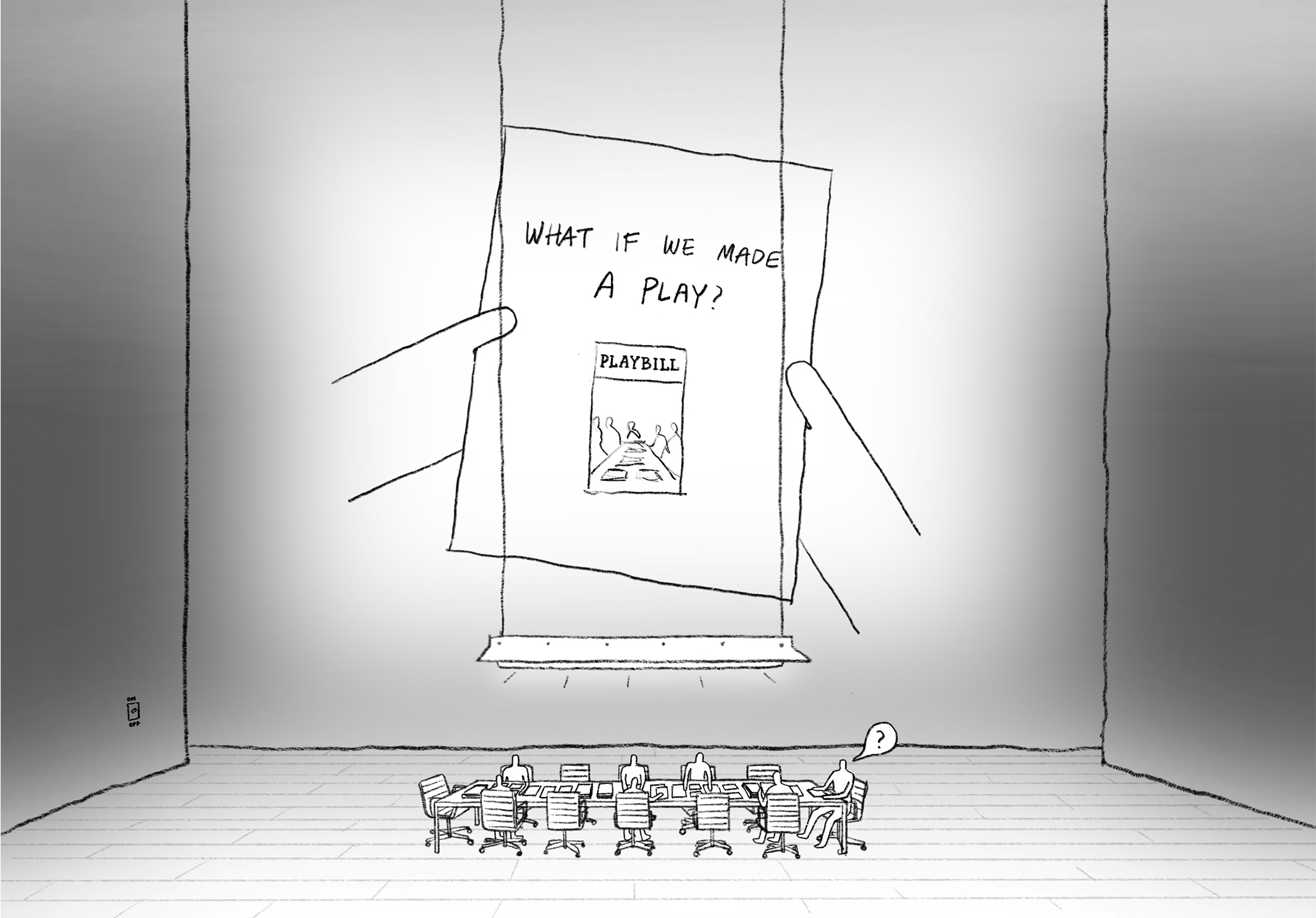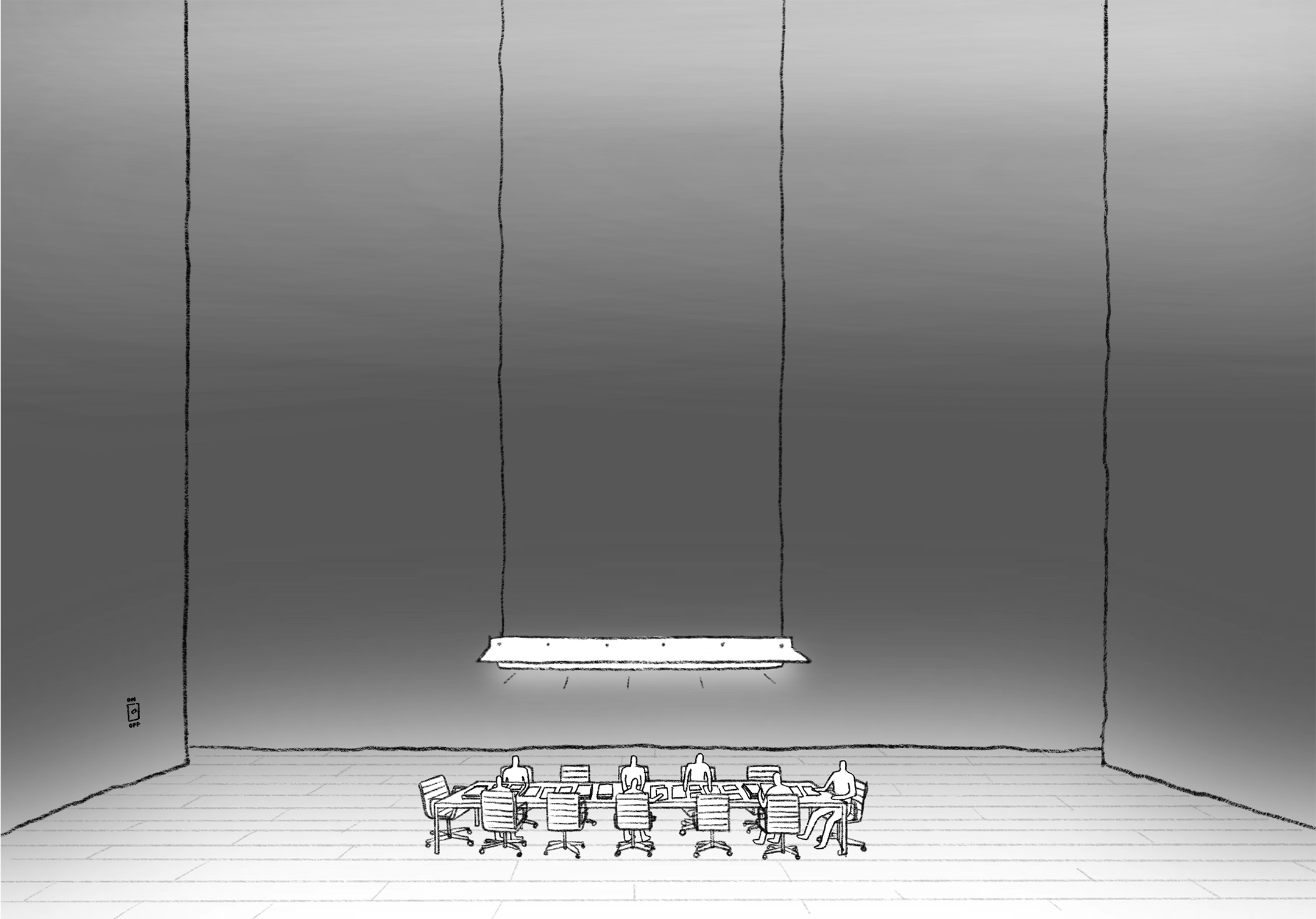 PL-Cutting-Room-Floor-3.pngThe play opens on a single meeting room. The audience can barely see anything, as the lights are dimmed to a minimum. Squinting, they can barely make out a long table in the middle of the room, with office chairs around it. Papers are scattered on the floor.