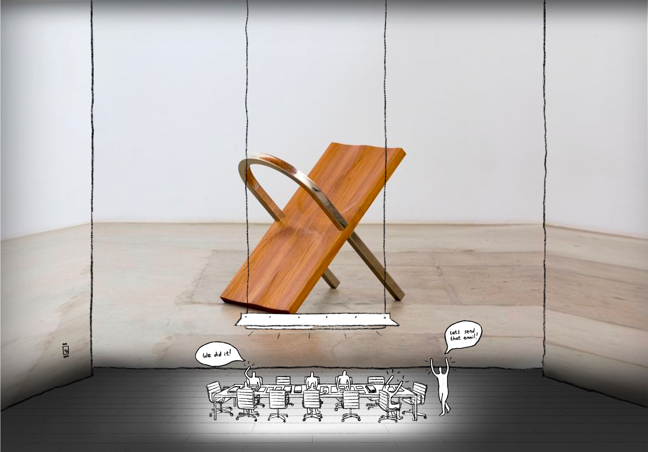 PL-Cutting-Room-Floor-6.pngSomeone picks up one of the pieces of paper, and shares it with the group. The paper reads: “What if a chair only had two legs?” This paper is then projected onto the back wall in the meeting room, but the individuals do not acknowledge the presence of this wall—as its for the audience only. Dialogue passionately continues around this idea.