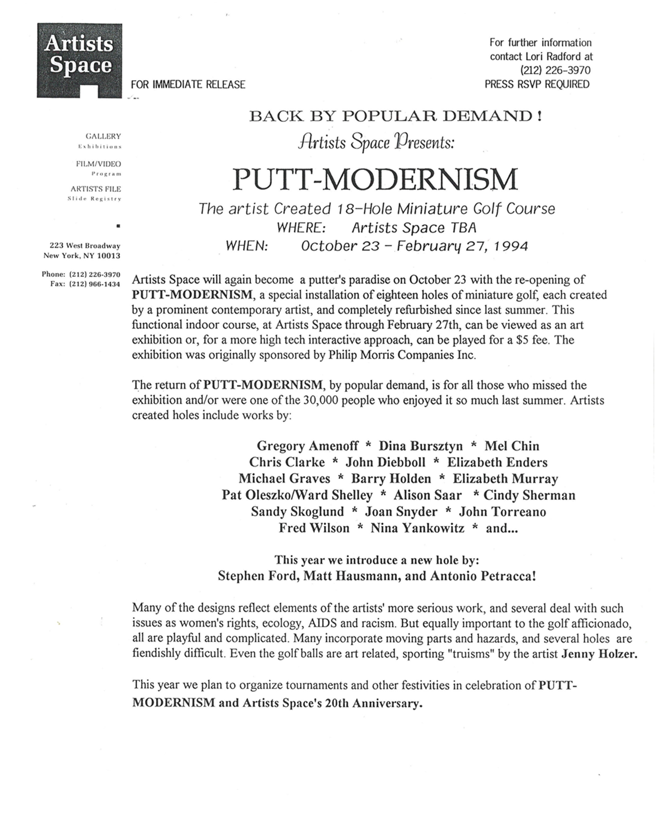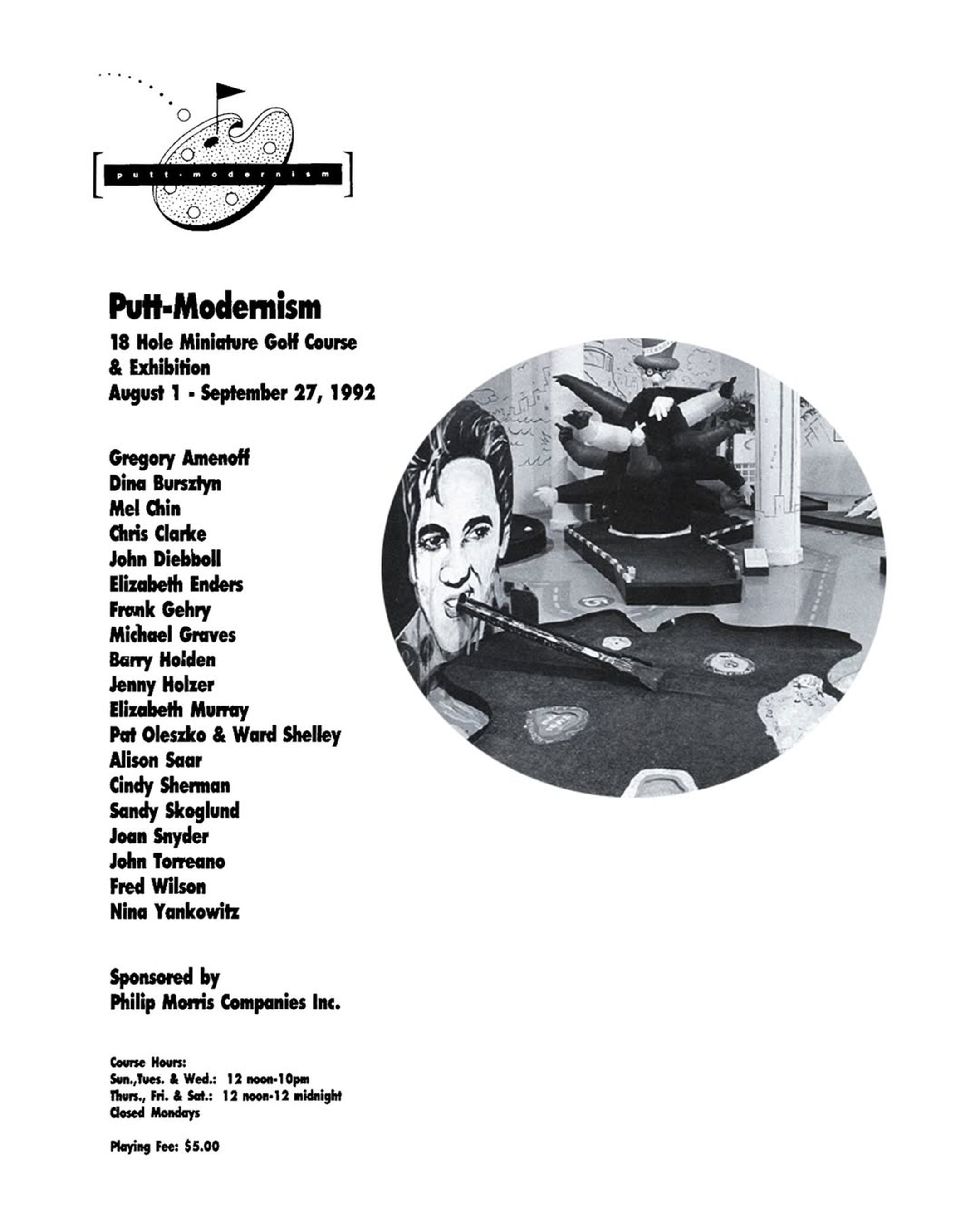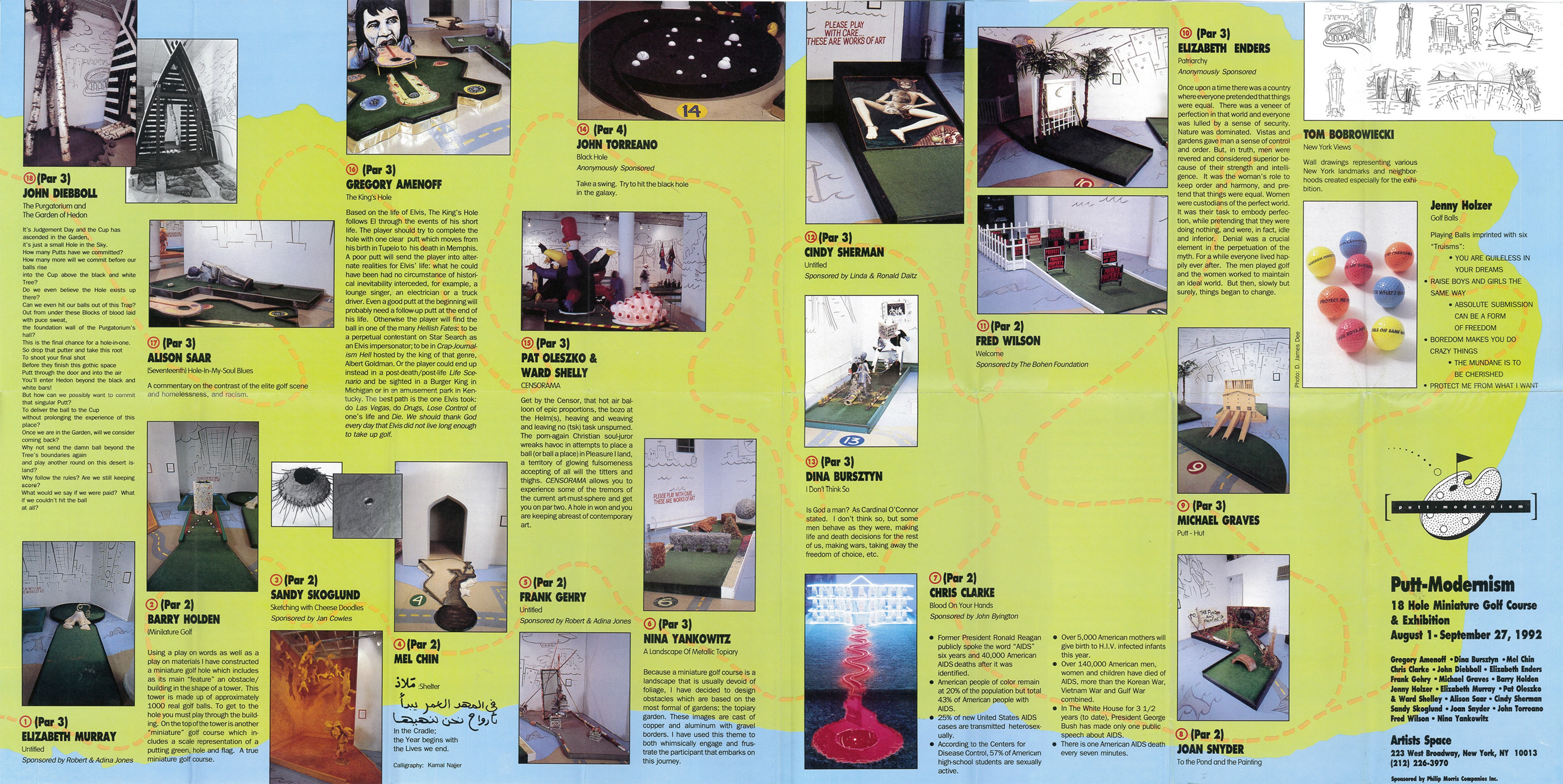 In 1992, Artist Space in New York opened Putt-Modernism—an interactive exhibition of a complete 18 holes of mini-golf, designed by contemporary artists and designers that included Frank Gehry, Cindy Sherman, Michael Graves and Jenny Holzer.